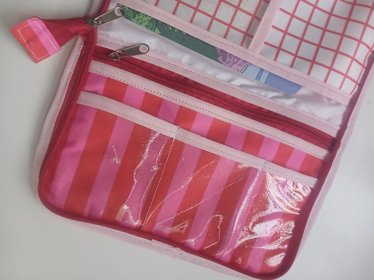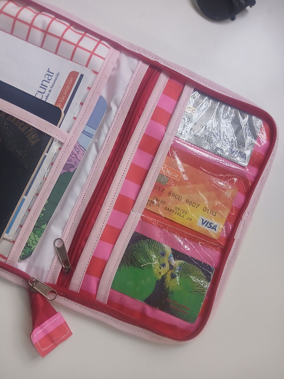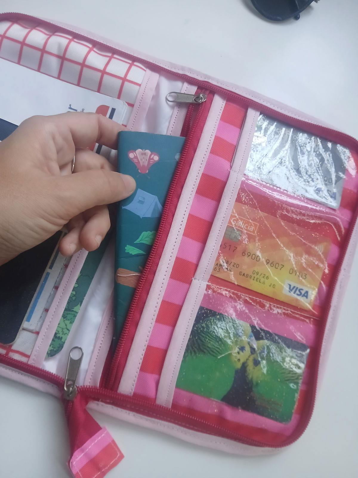 Tiene tres bolsillos , uno con cierre y espacio para 3 tarjetas