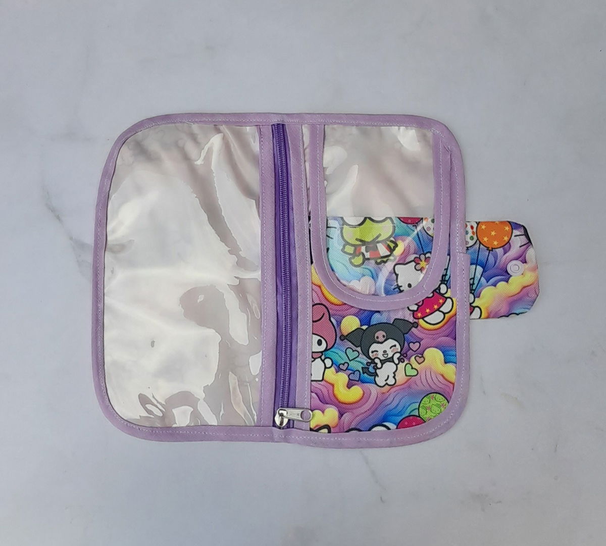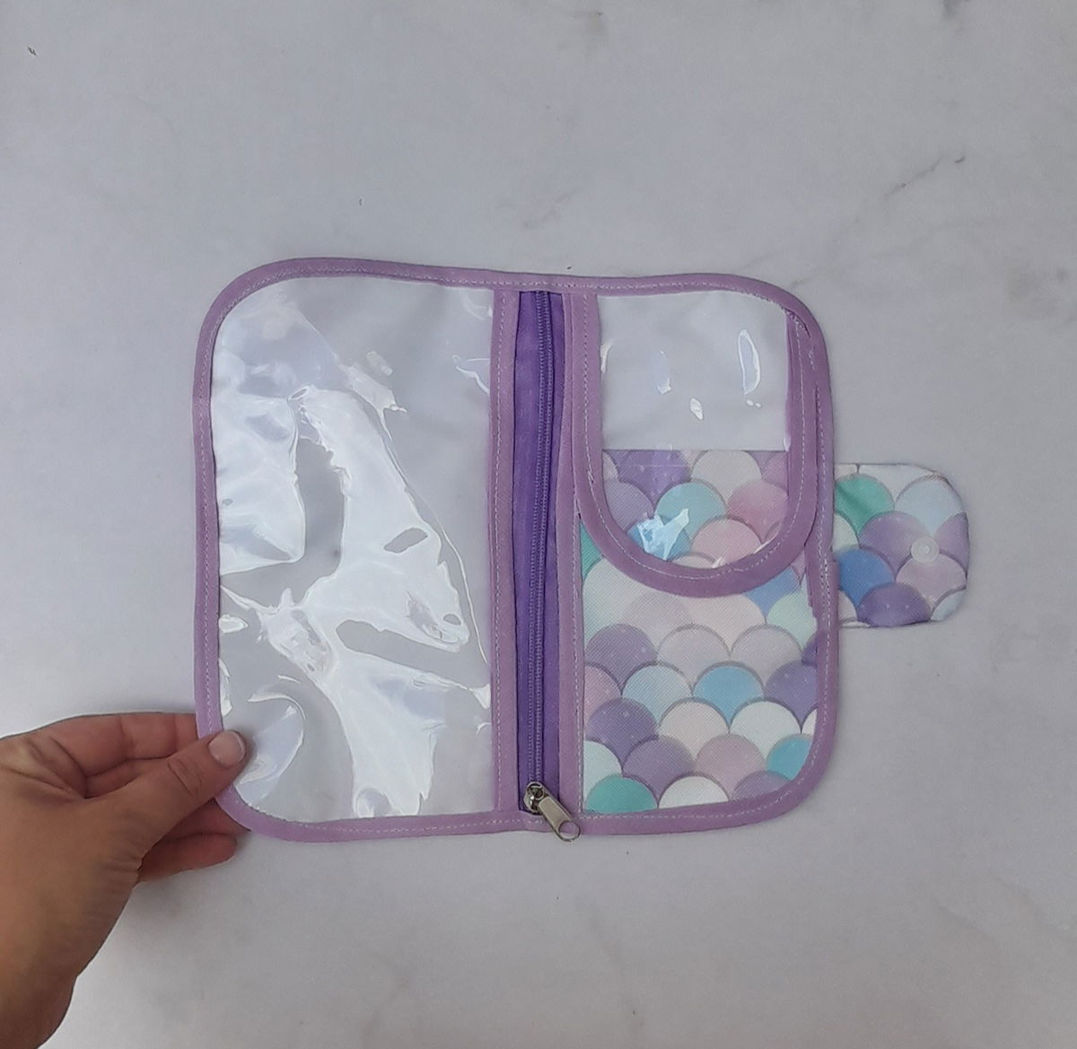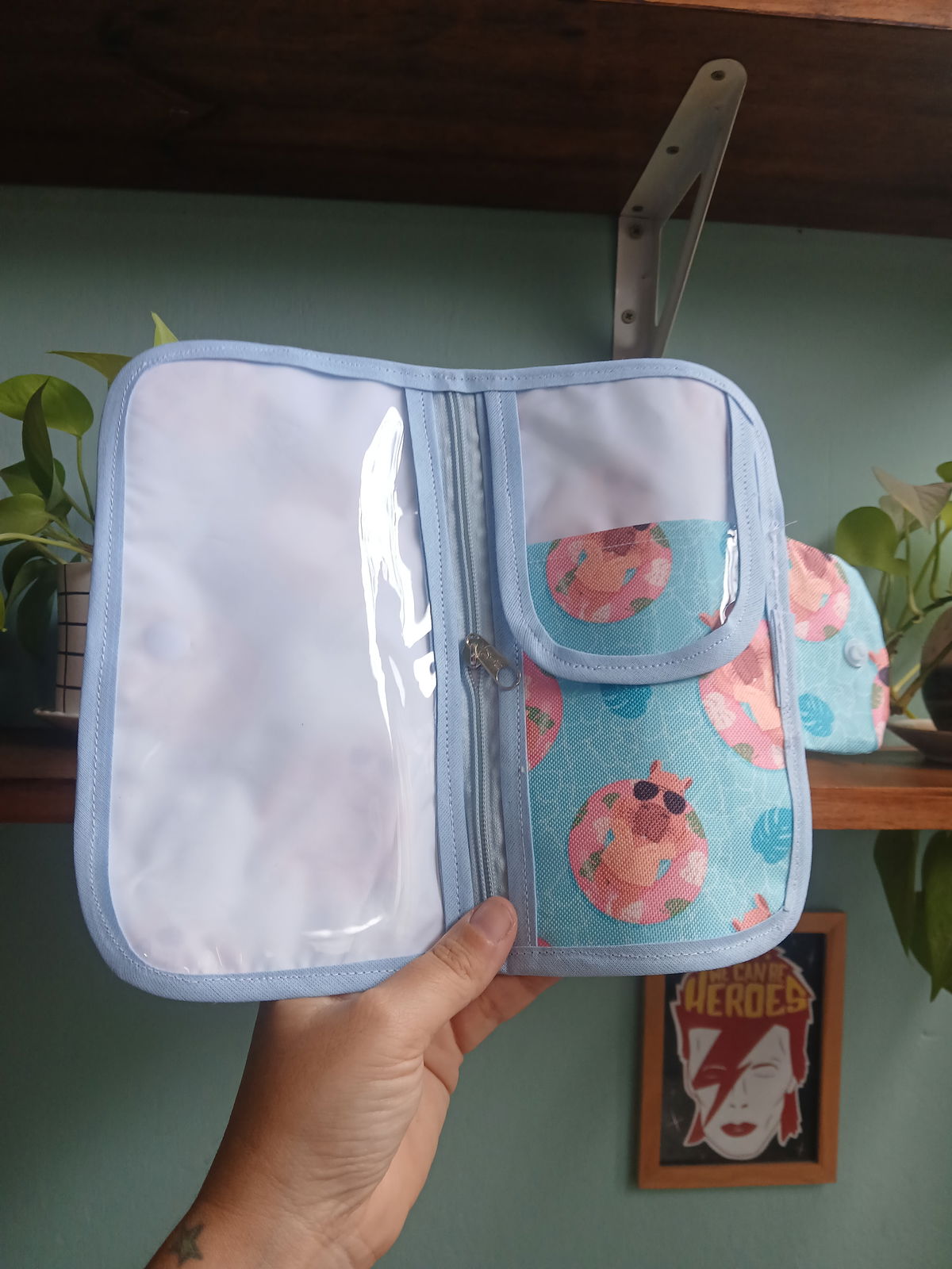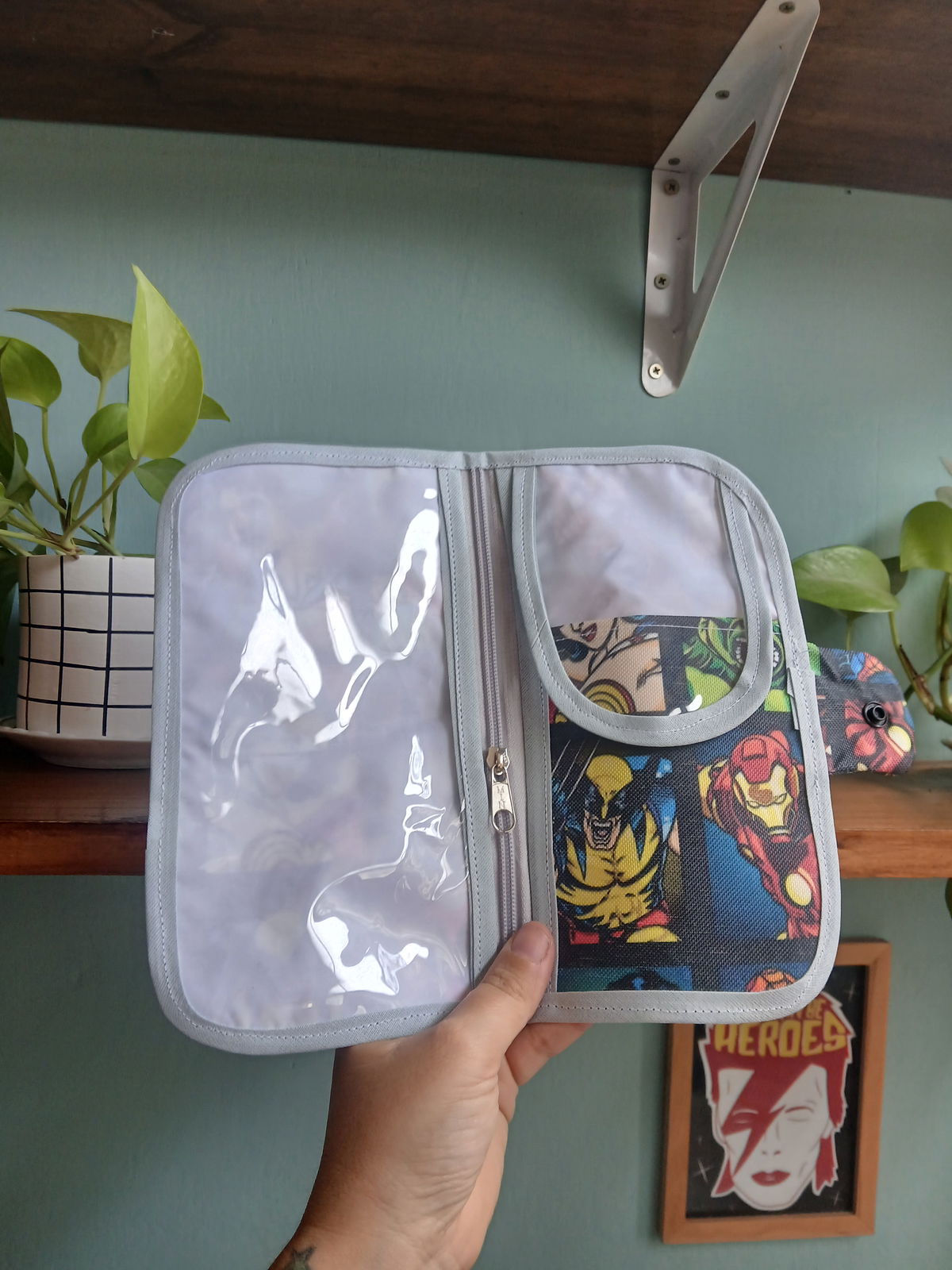 Tiene un bolsillo con tapa y otro transparente con cierre.