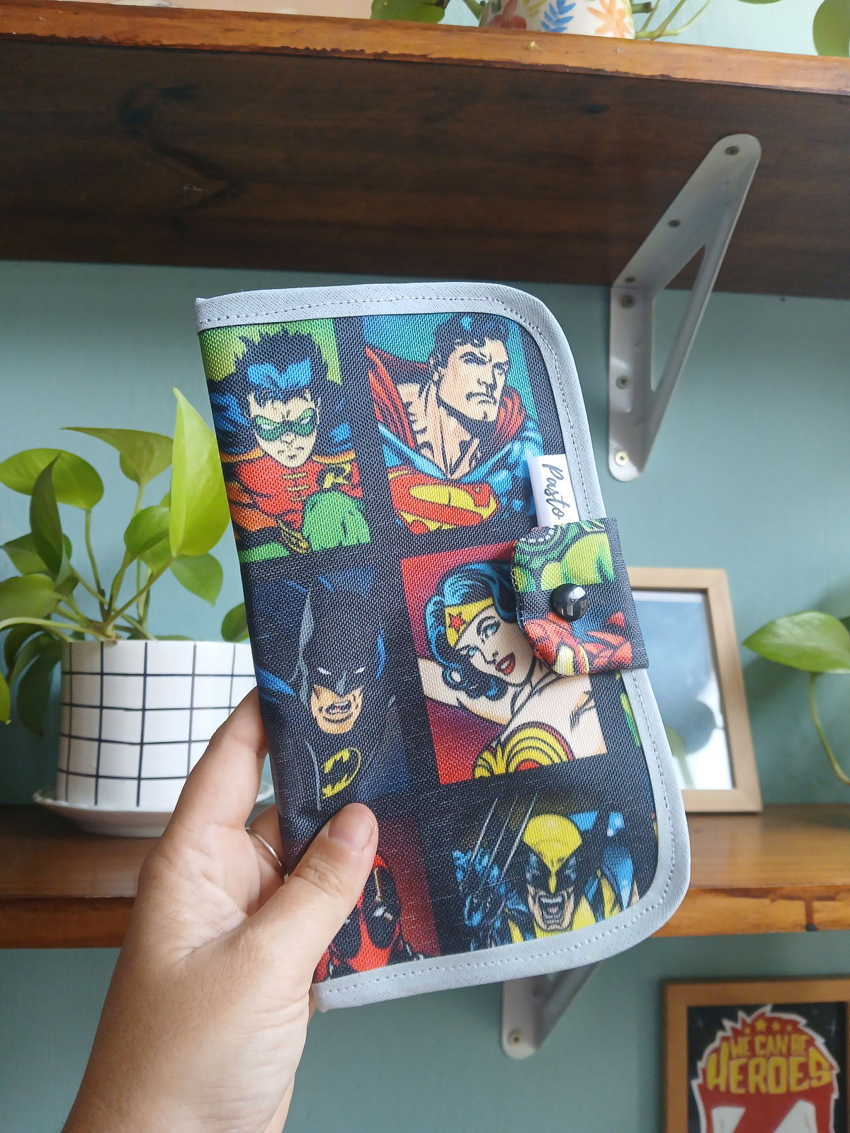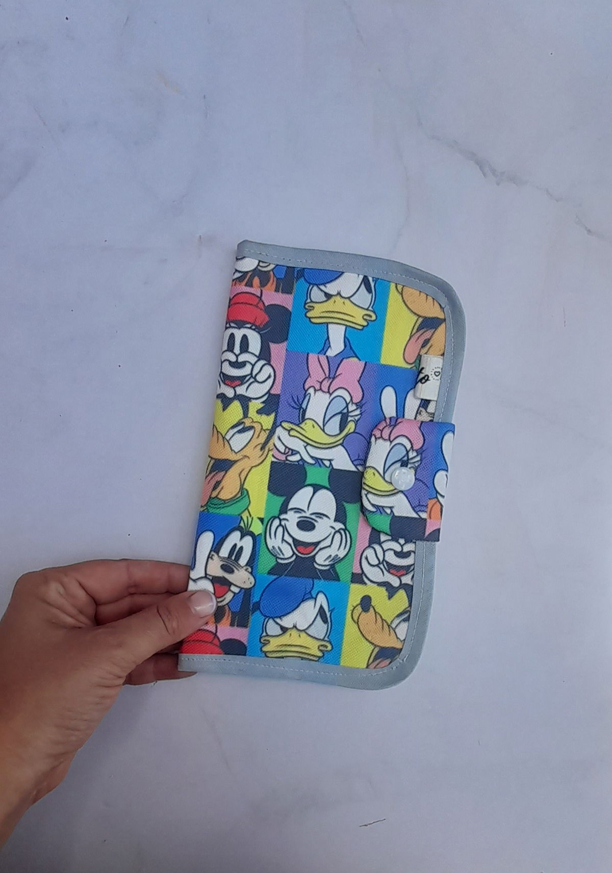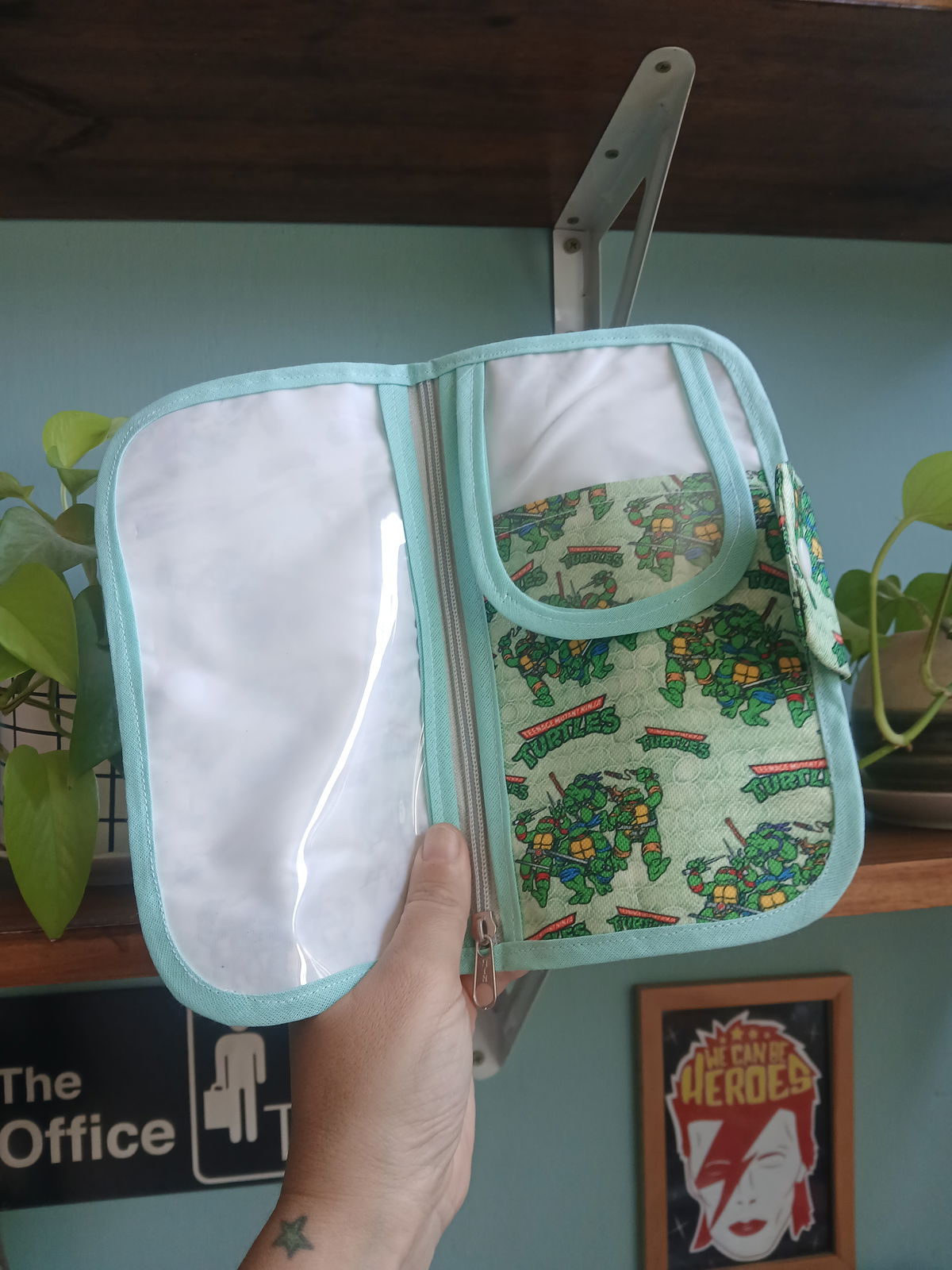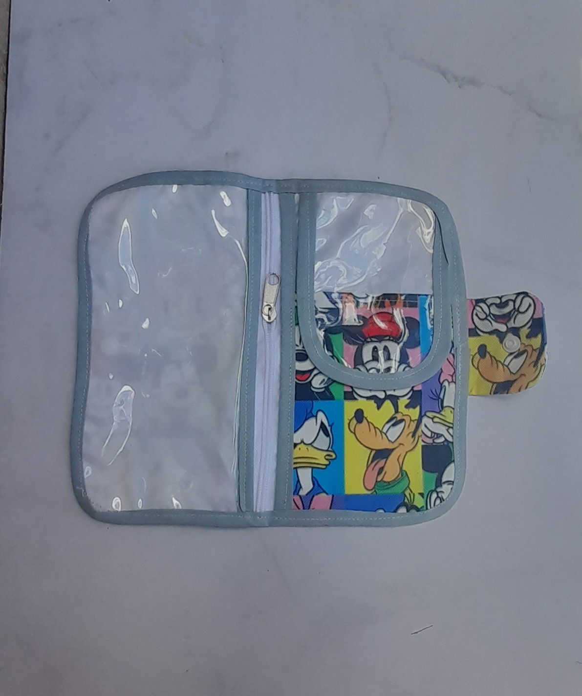 Tiene un bolsillo con tapa y otro transparente con cierre.