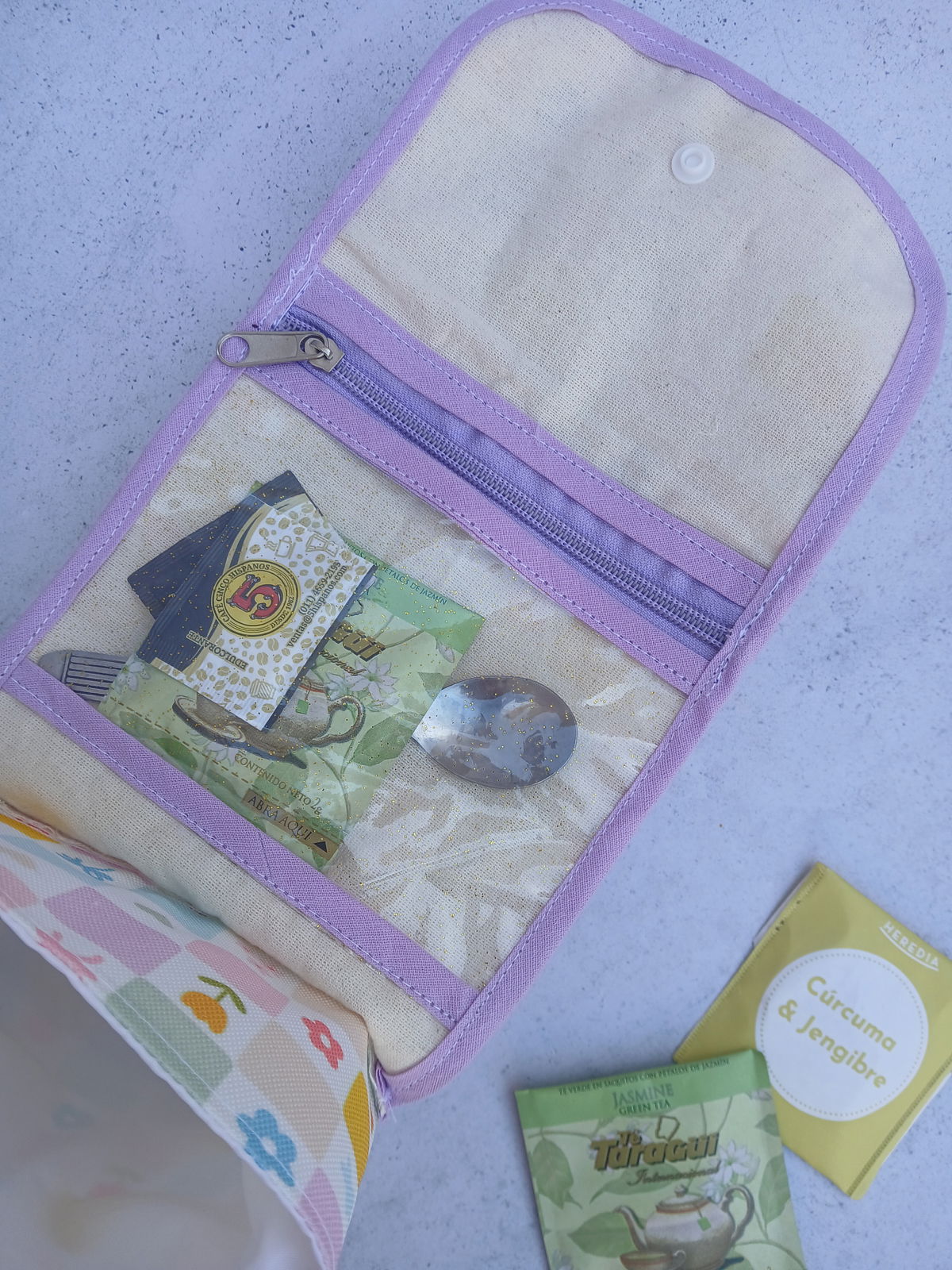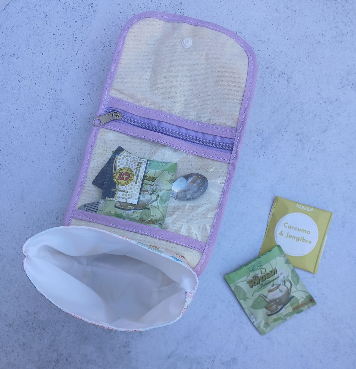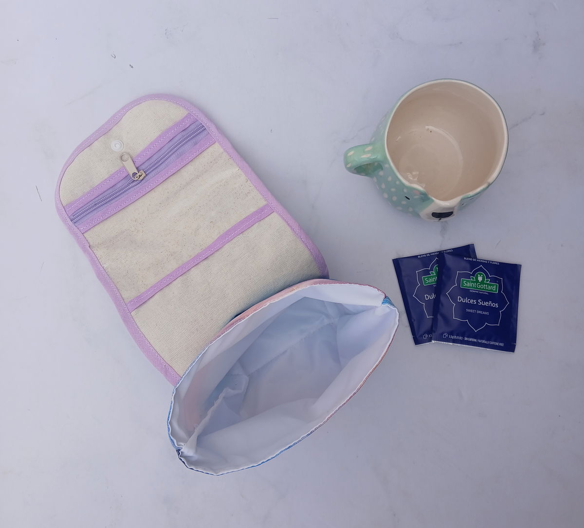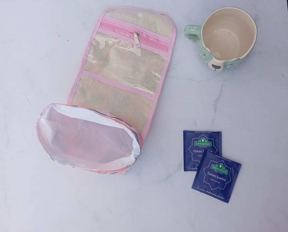 Estuche porta taza, incluye un cesto contenedor, tiene un bolsillo interno con cierre y tiene manija