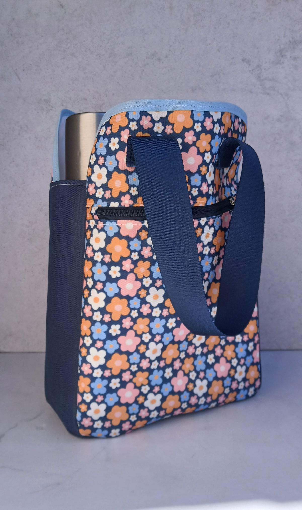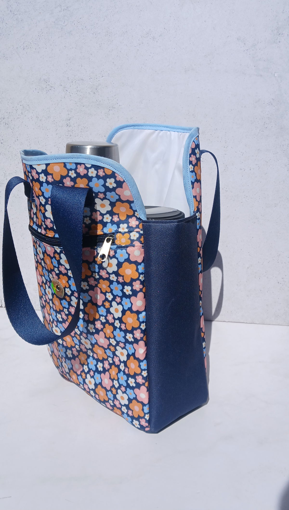 Tiene un bolsillo frontal con cierre y contenedor regulable para termo/botella