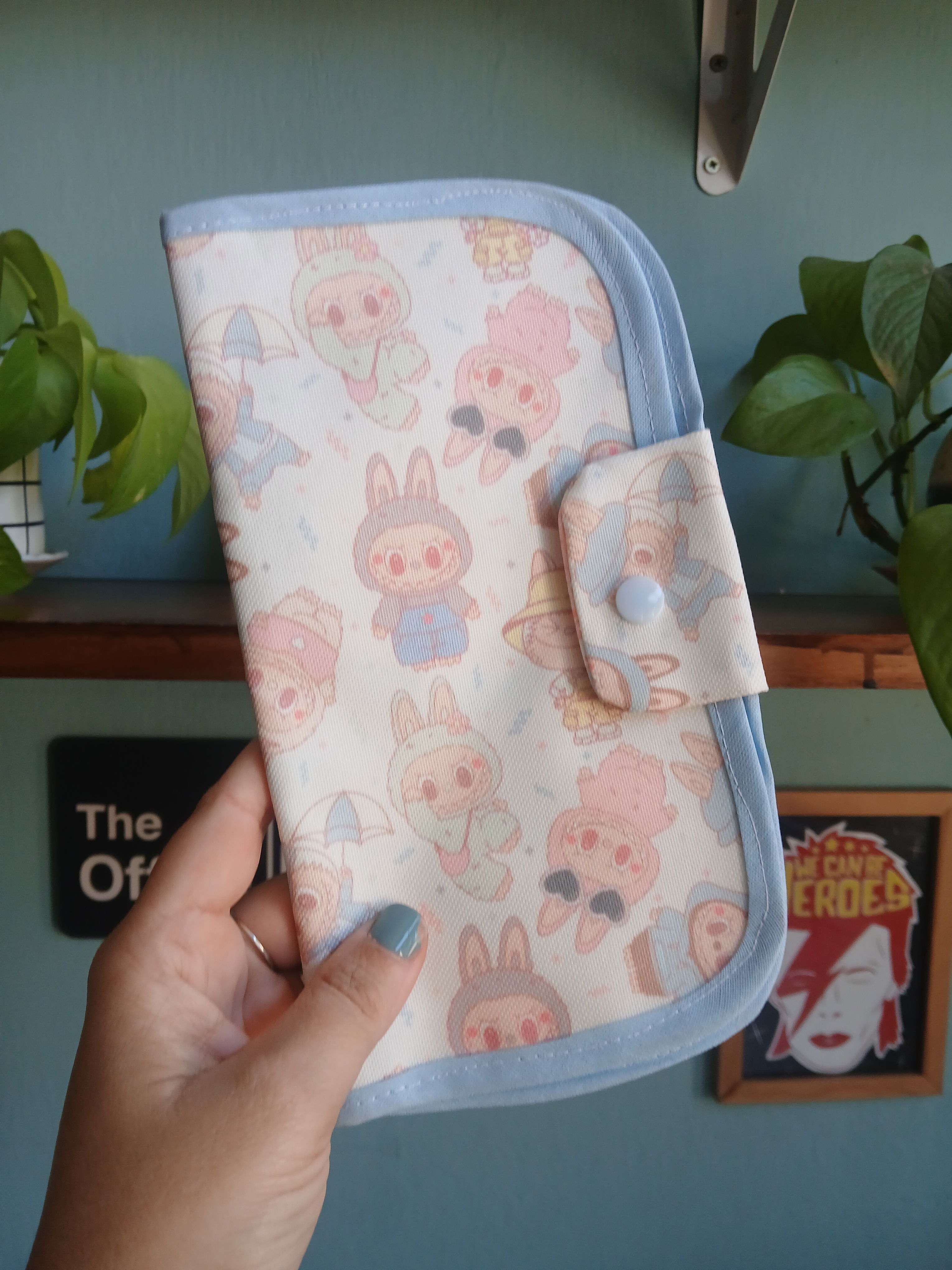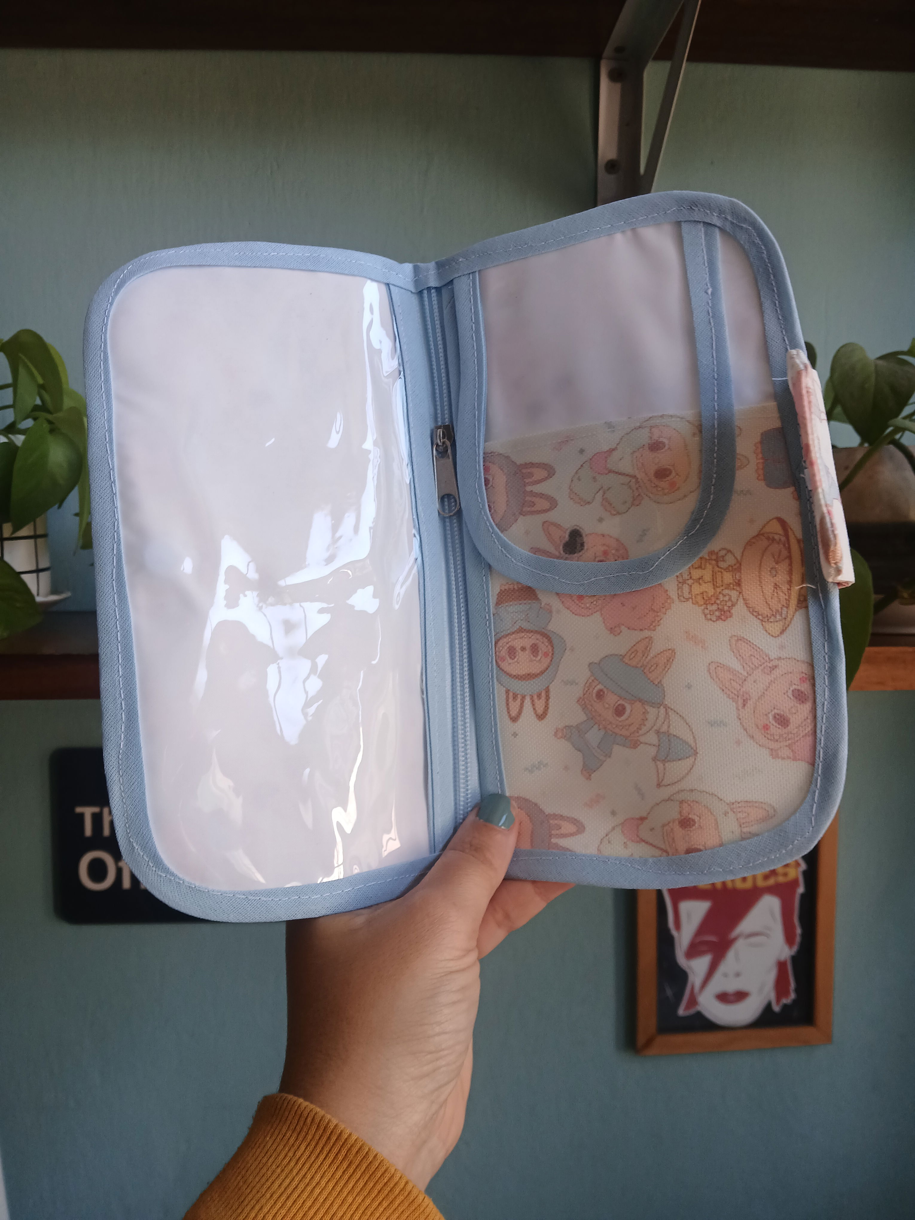 Tiene un bolsillo con tapa y otro transparente con cierre.