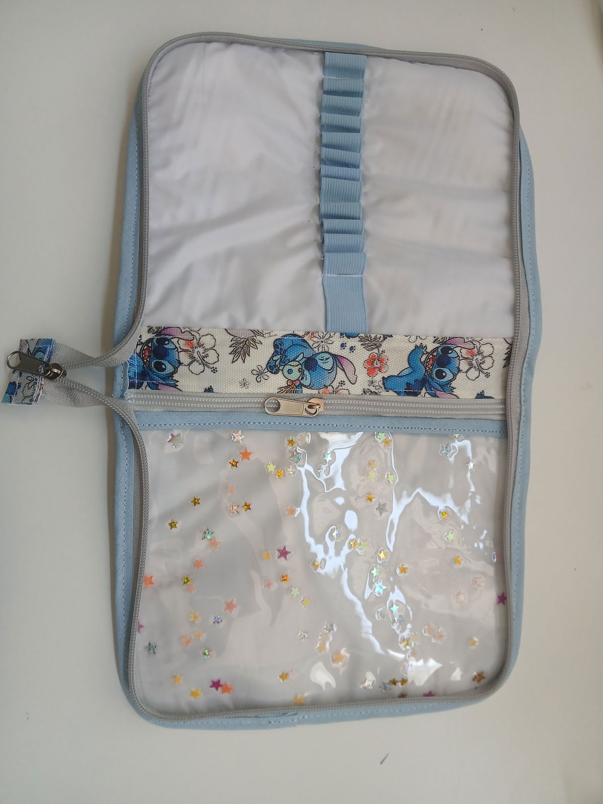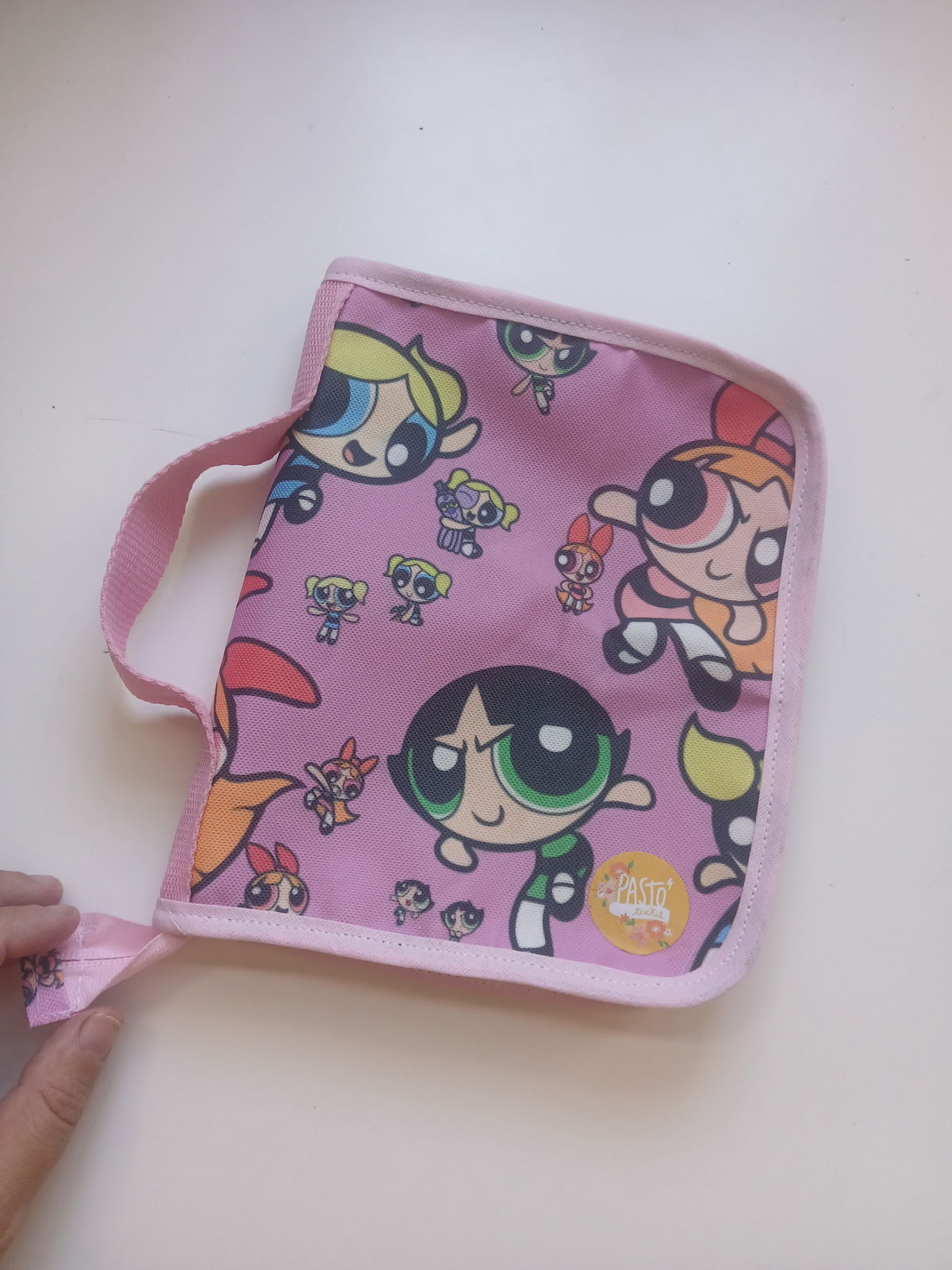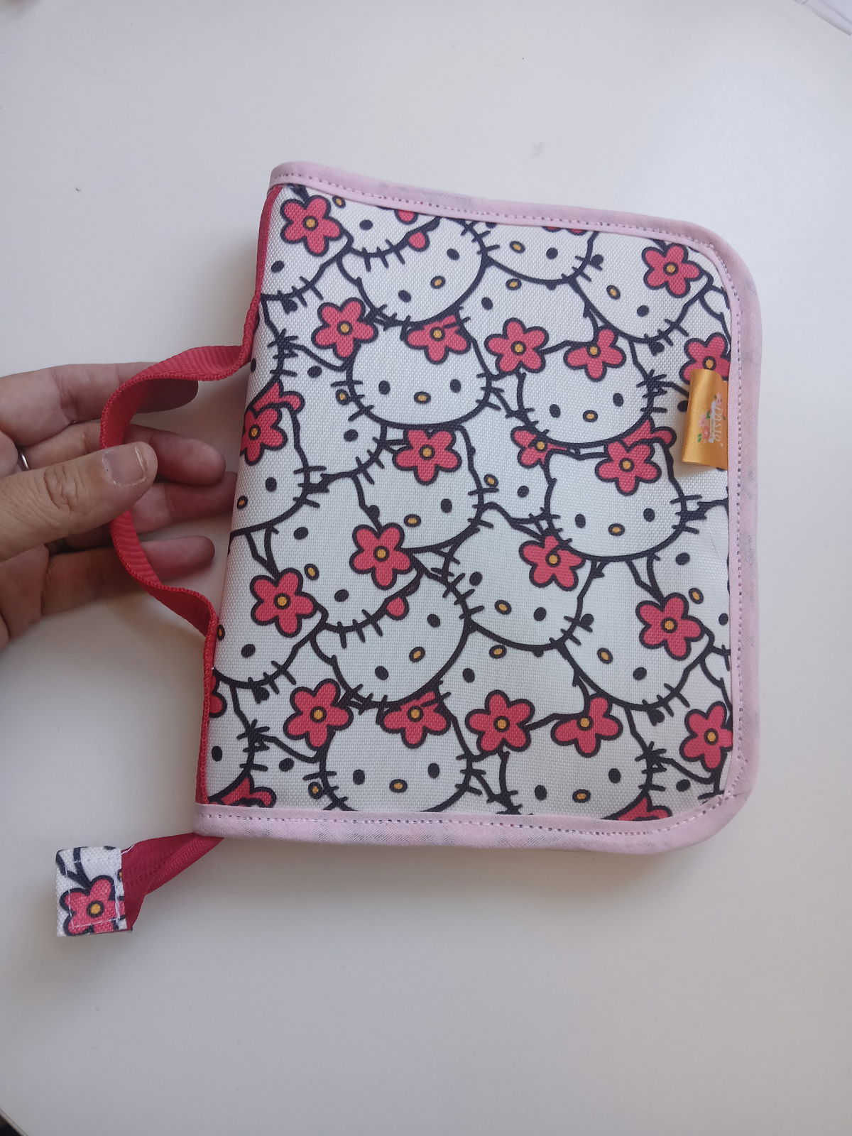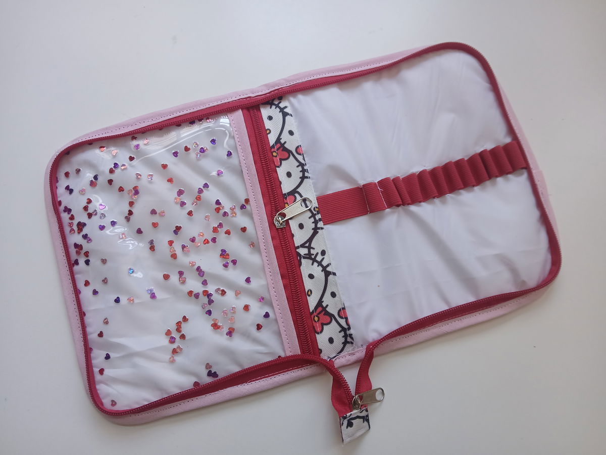 Es tipo canopla, con espacio para 12 lápices, una goma, un bolsillo amplio con cierre y cinta para trasladarla