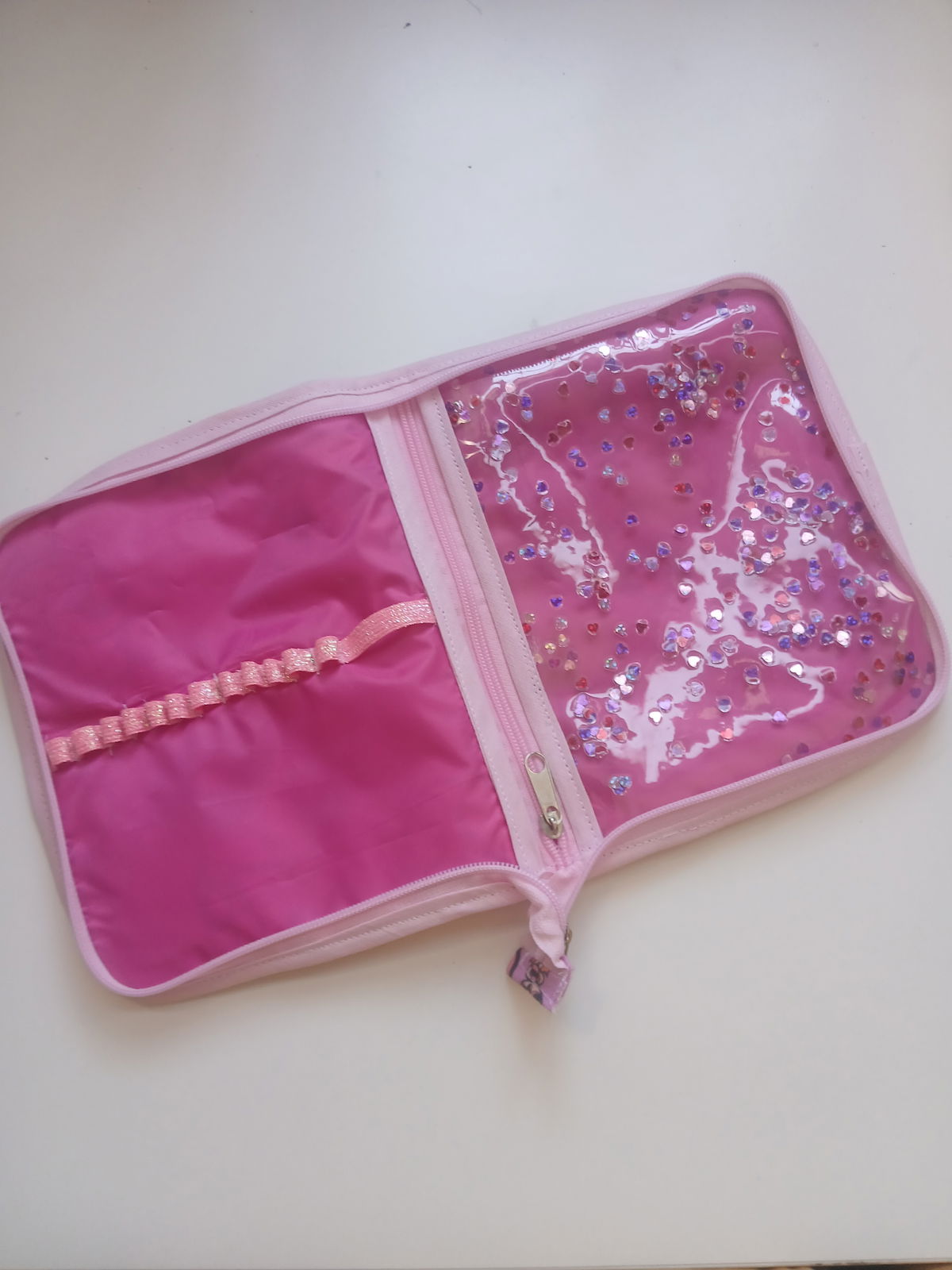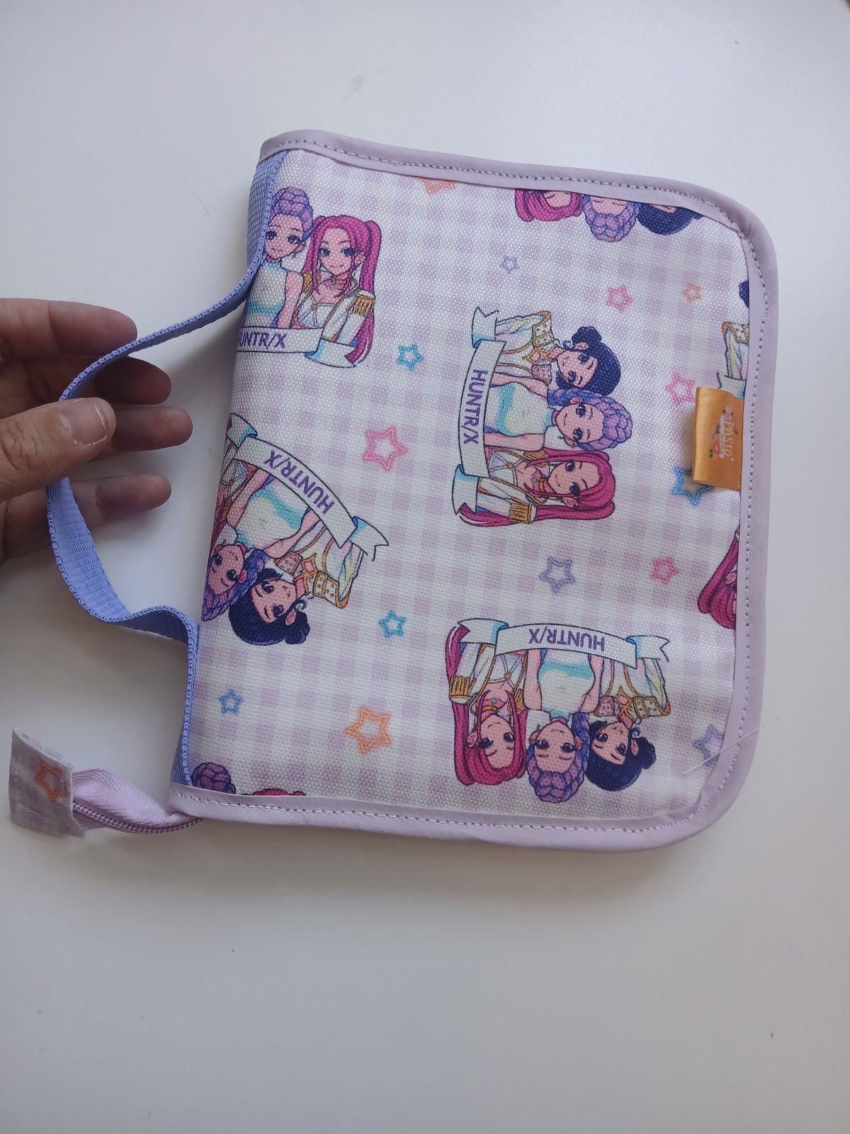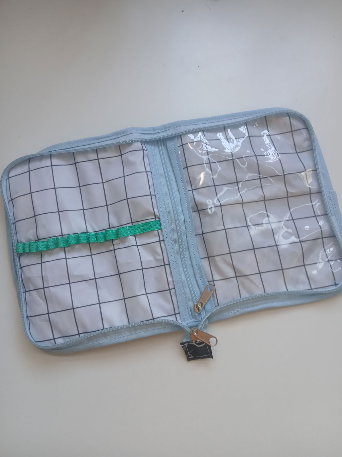 Es tipo canopla, con espacio para 12 lápices, una goma, un bolsillo amplio con cierre y cinta para trasladarla