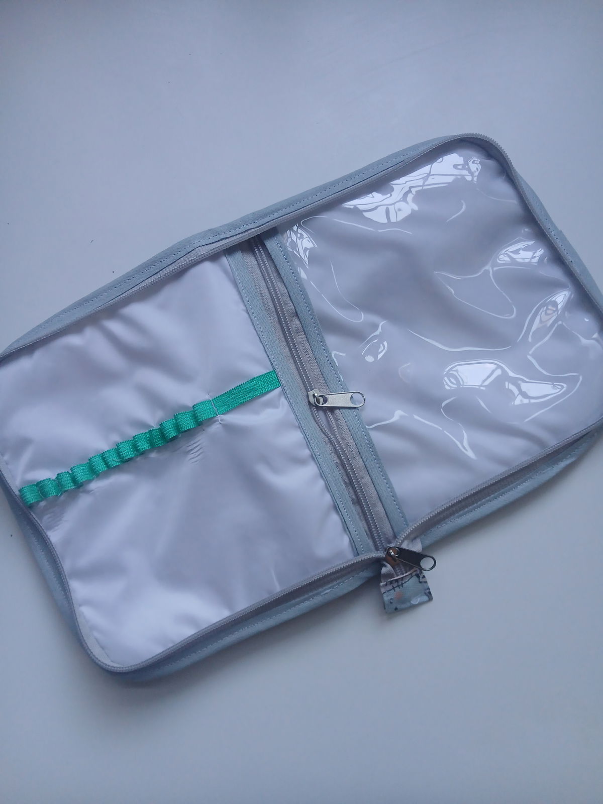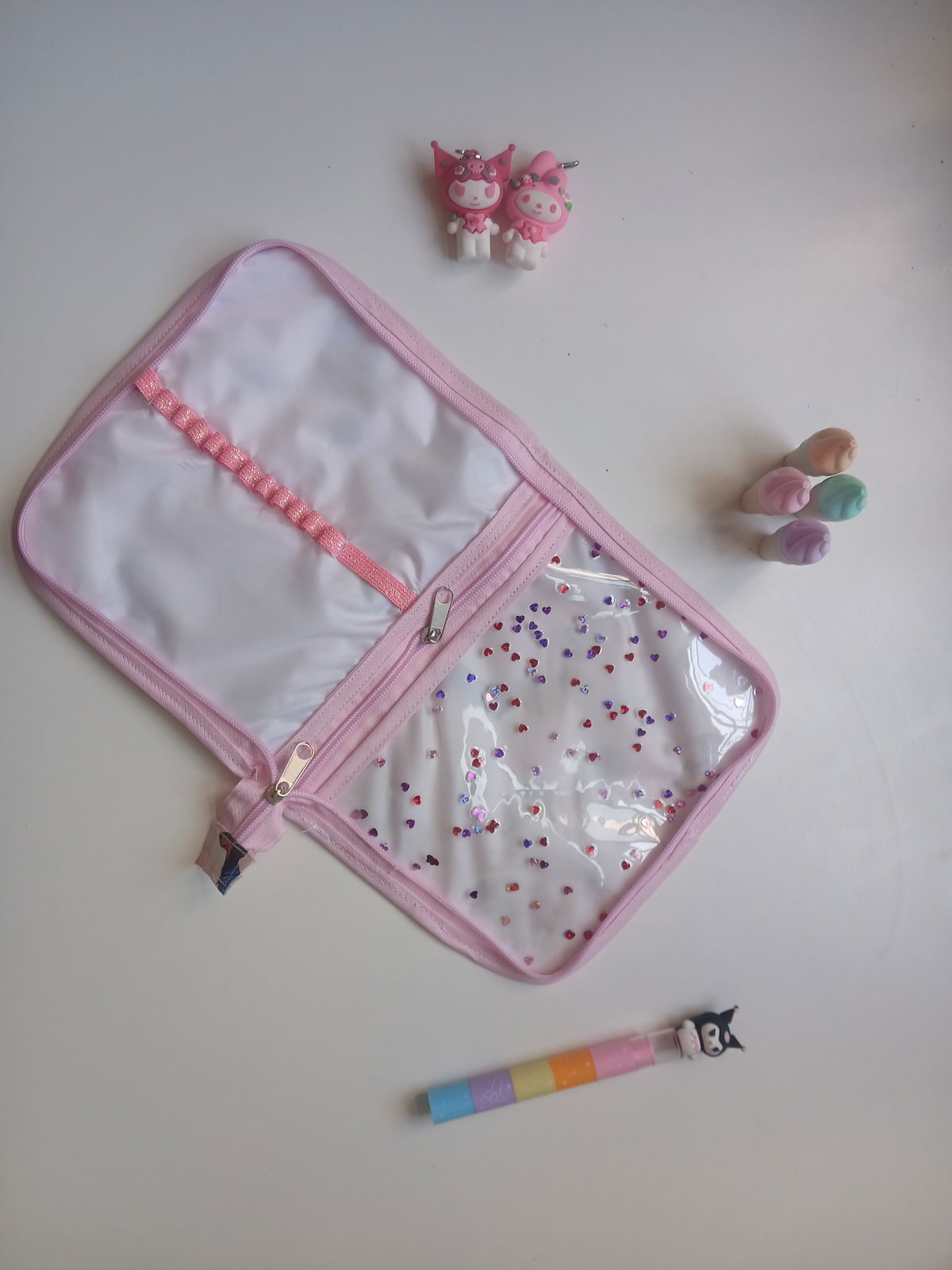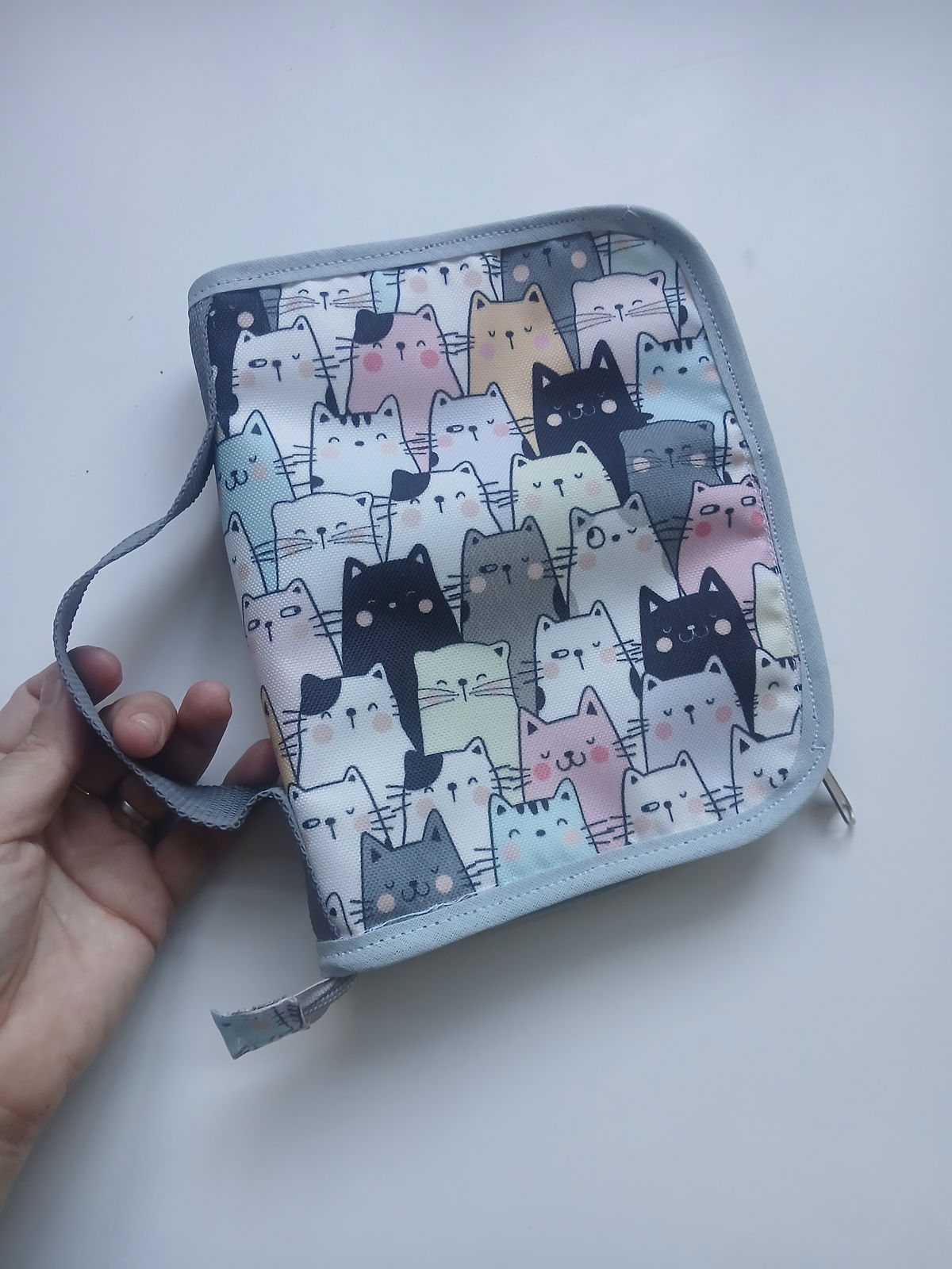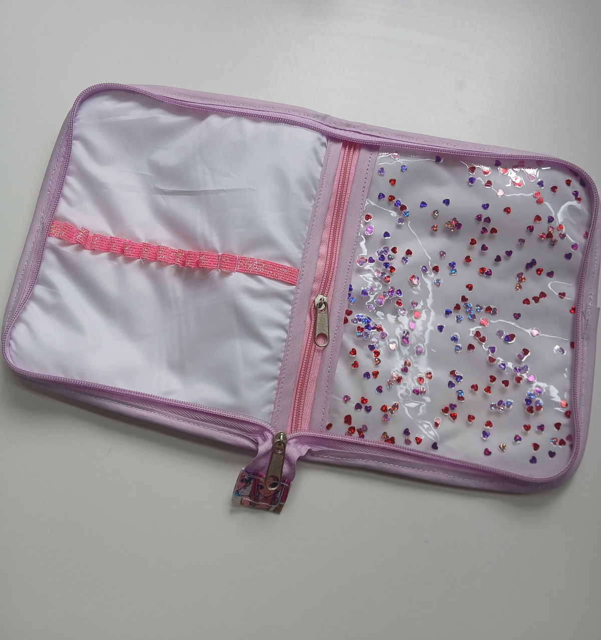 Es tipo canopla, con espacio para 12 lápices, una goma, un bolsillo amplio con cierre y cinta para trasladarla