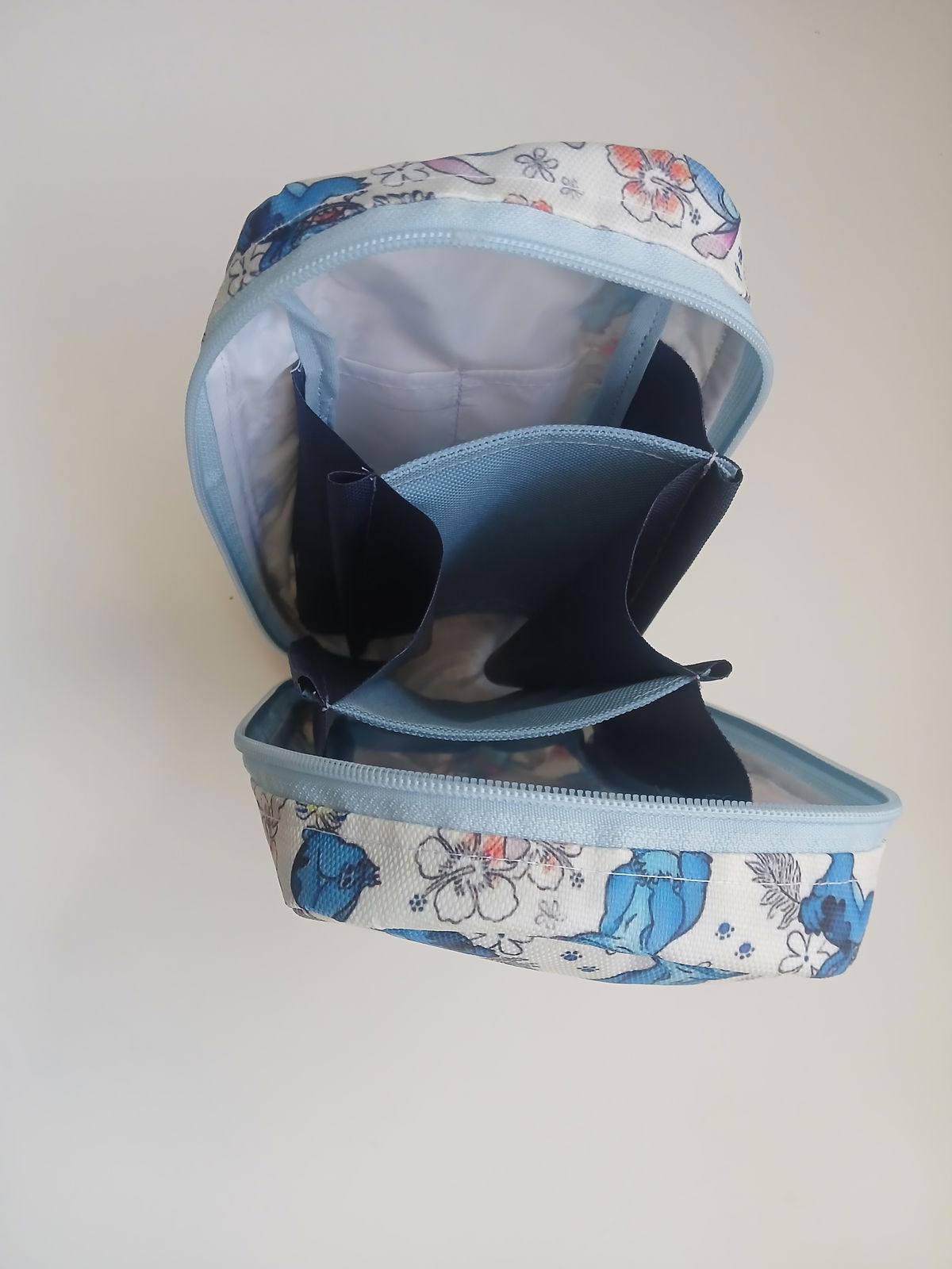 Realizada en cordura exterior, interior forrado en silver impermeable, tres espacios de guardado y tres bolsillos internos