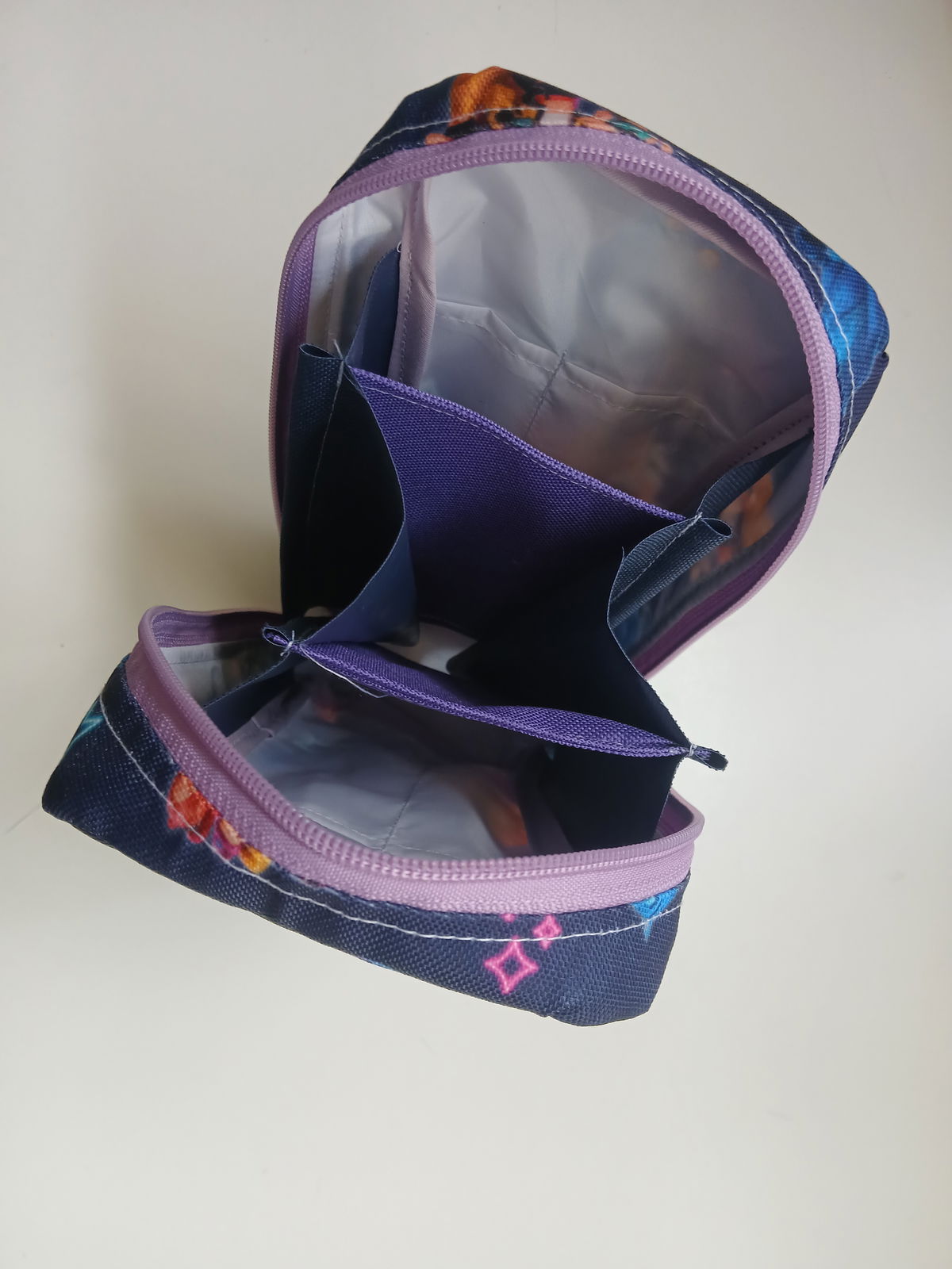 Realizada en cordura exterior, interior forrado en silver impermeable, tres espacios de guardado y tres bolsillos internos